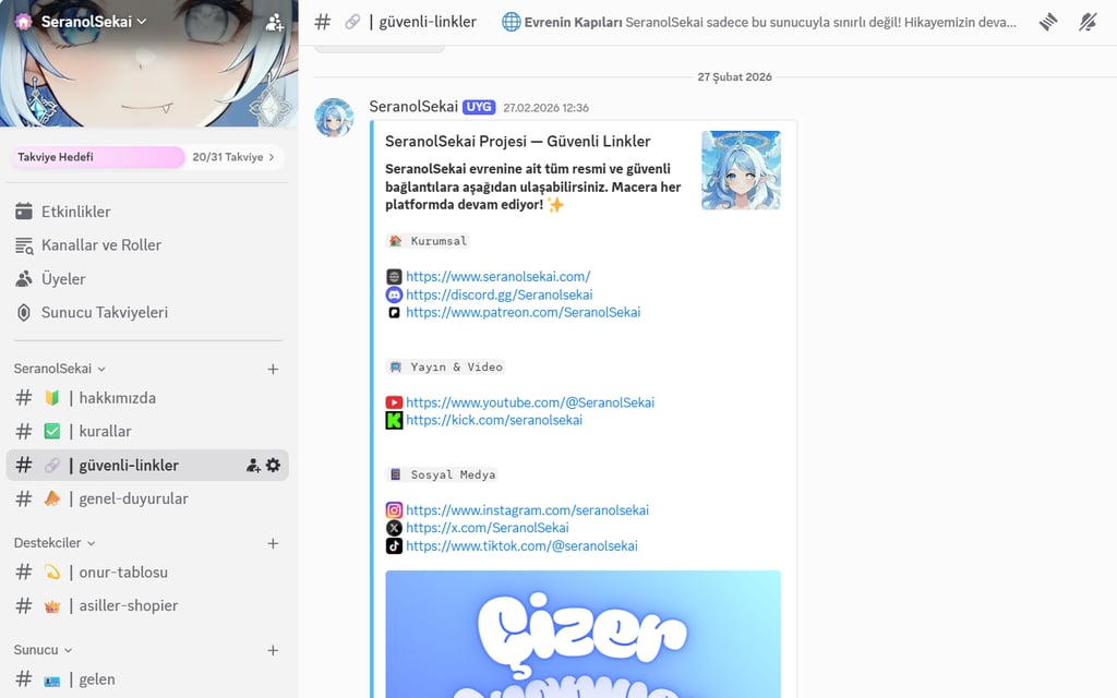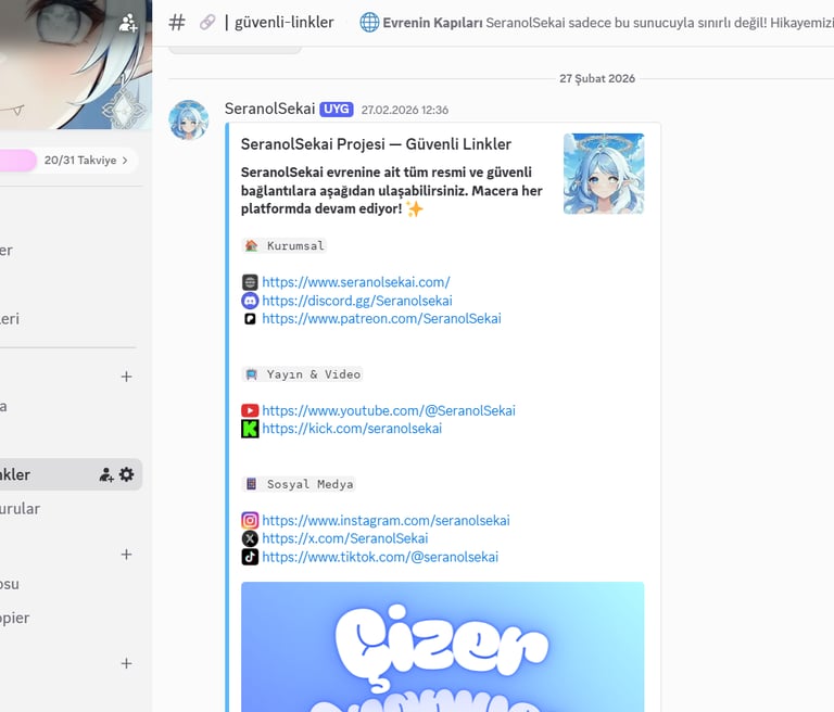 Projemizin kalbinin atacağı, topluluğumuzla bir araya geleceğimiz resmi Discord sunucumuz bugün itibarıyla yayında! Gelişmeleri yakından takip etmek, fikirlerinizi paylaşmak ve bu evrenin bir parçası olmak için hepinizi bekliyoruz. SeranolSekai dünyasına ilk adımınızı atın!